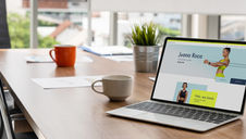 A series of images capturing the office environment, including black coffee cups and pods on a wooden surface, a laptop displaying fitness website on an office table, and a person presenting at a startup meeting with a whiteboard.